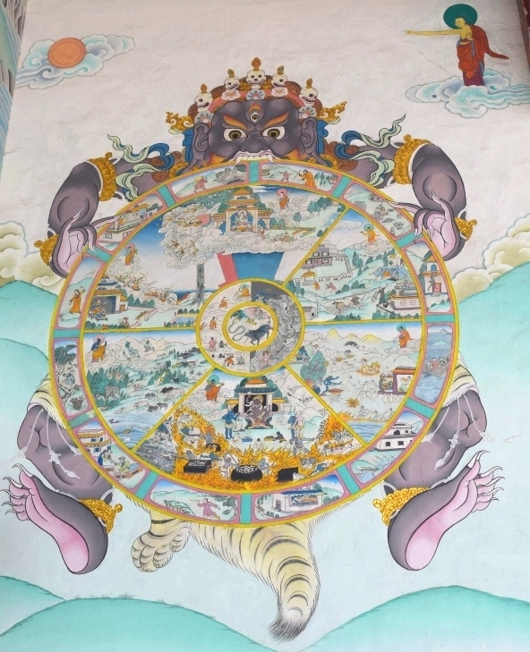 Das Rad der Inkarnation zeigt die Lebewesen in den sechs Daseinsbereichen nach der Auffassung des tibetischen Buddhismus | Wandmalerei im Benchen Kloster, Kathmandu, Nepal (©Moni Wakefield)